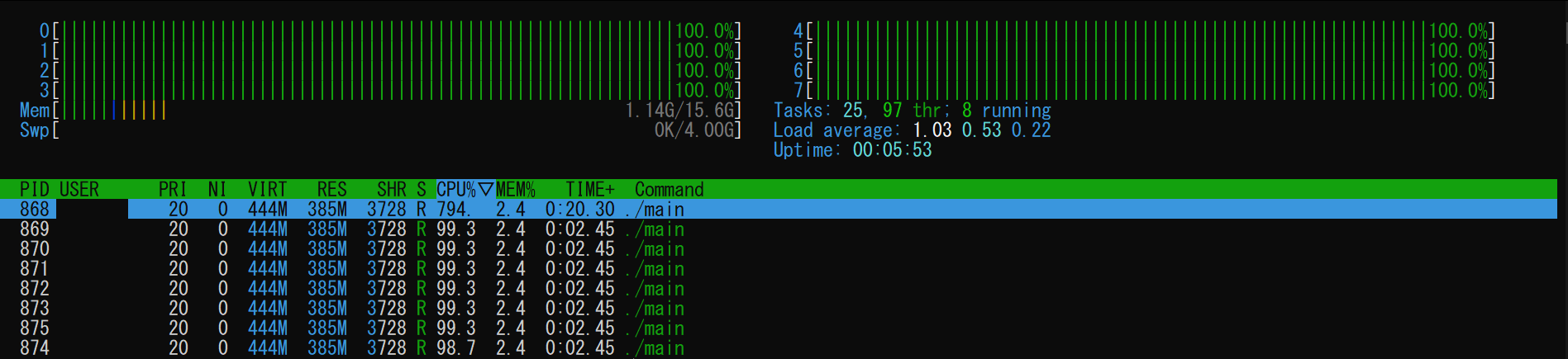 プロセスを監視するコマンドである、htopコマンドからも8スレッドすべてを用いてプログラムを実行している様子を確認することができました。
