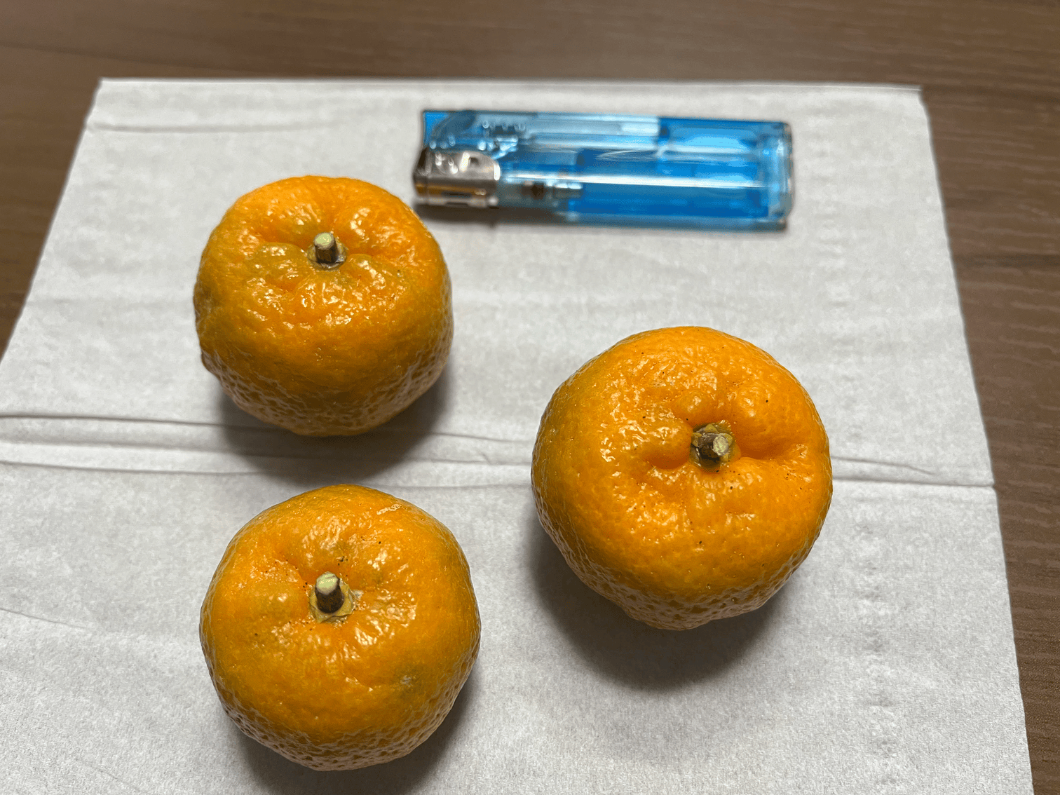 最終的2月初めに↓このように3つ収穫しました。小ミカンの品種名の通りライターと比較しても小さいことが分かると思います。