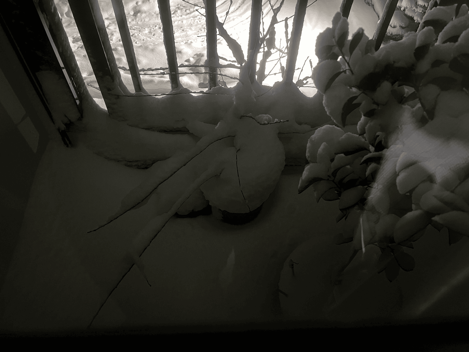 夜の間にもどんどん降雪量が増えました。さすがに屋根があるので植物が埋もれるほどは降っていません。