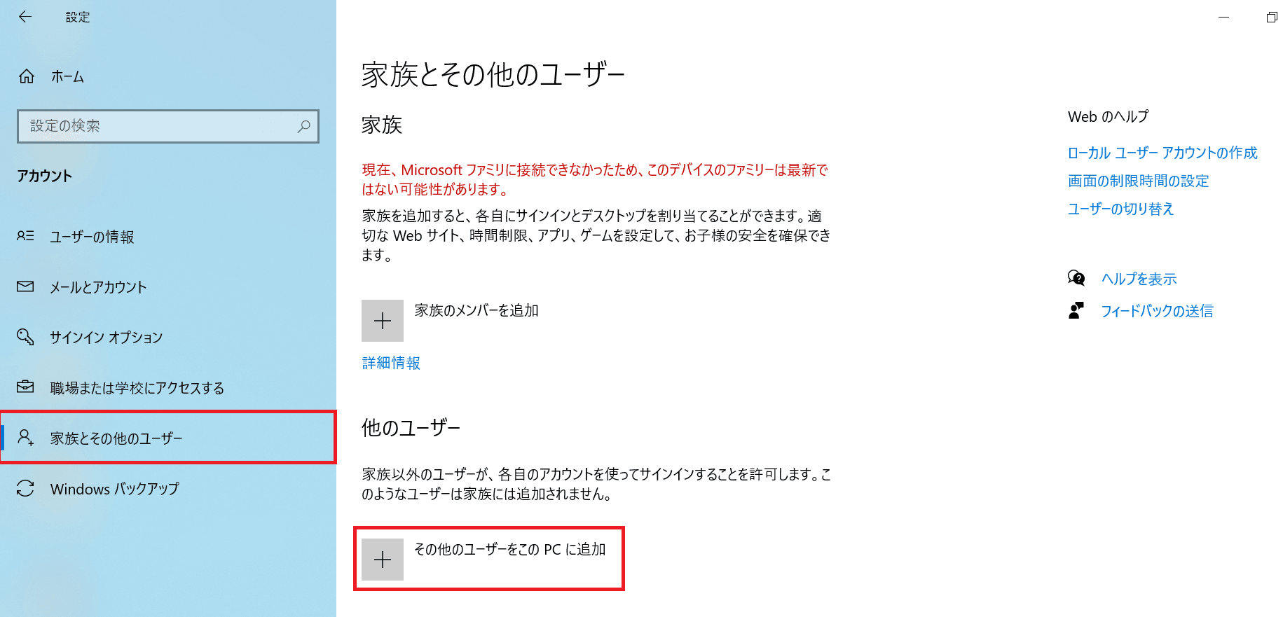 「スタート」→「設定」→「アカウント」→「家族とその他のユーザー」で以下の画面まで行き、「その他のユーザーをこのPCに追加」をクリックします。