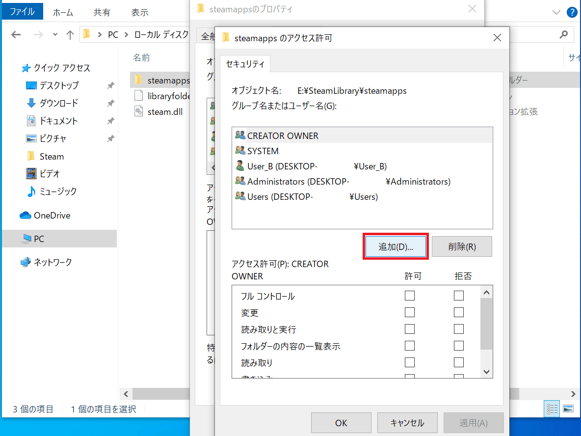 以上で、User_AからはEドライブのsteamappsに保存されているゲームが見えなくなり、User_BからはDドライブのsteamappsに保存されているゲームが見えなくなったはずです。
