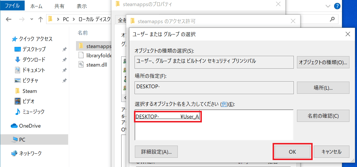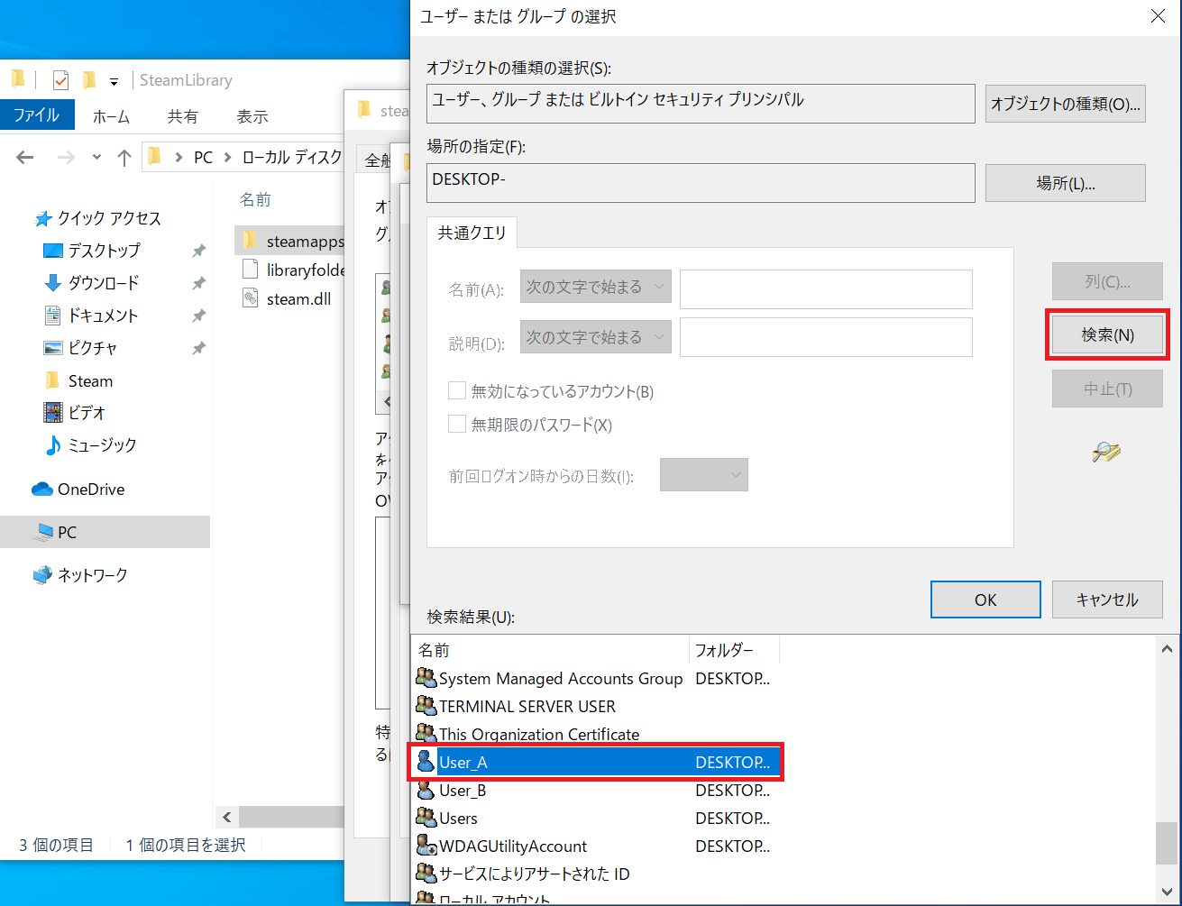アクセスを拒否するUserを選択します。以下例では、User_Bのゲームを保存しているsteamappsの権限を設定しているので、User_Aのアクセスを拒否するためにUser_Aを選択→「OK」