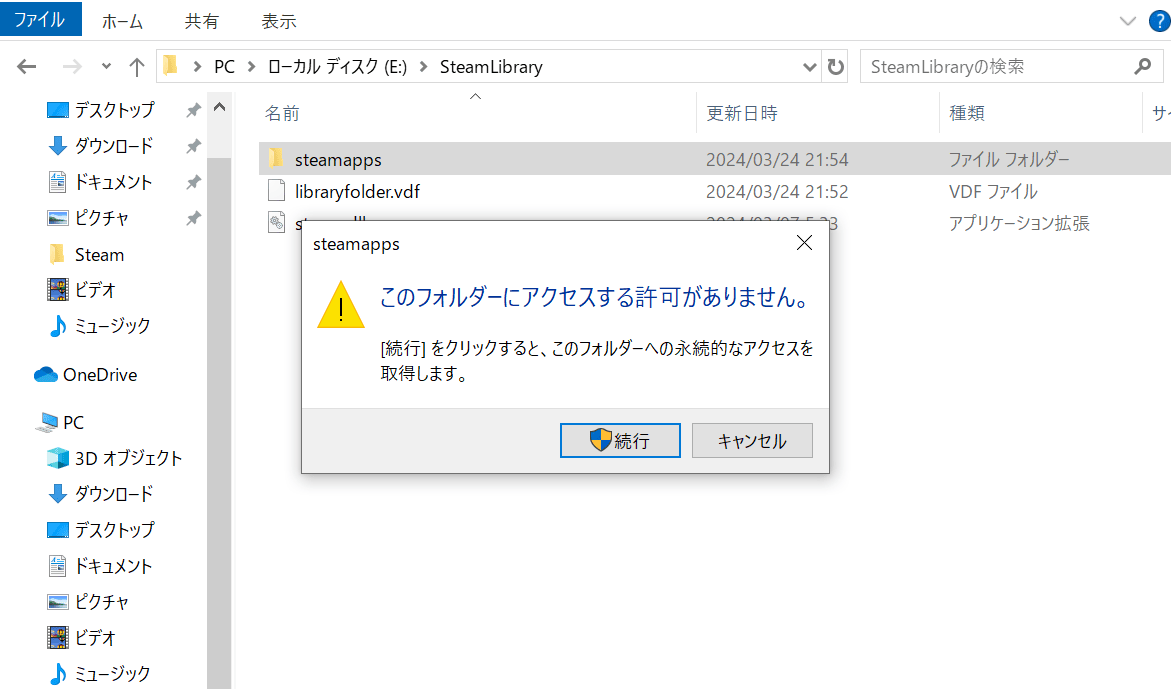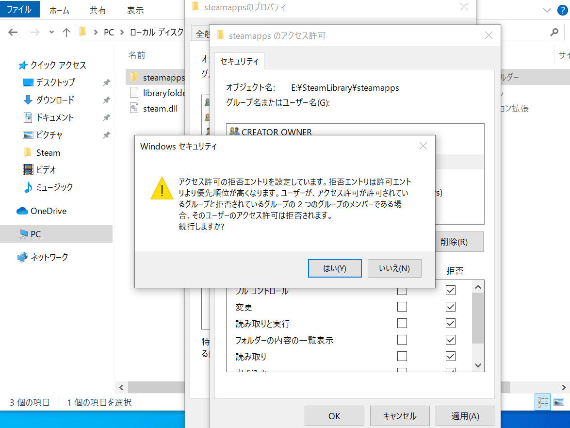 もう片方のSteamアカウントでも、他のアカウントからのアクセス制限をしたければ、対象ドライブのsteamappsのフォルダに上記手順で同じことを行います。