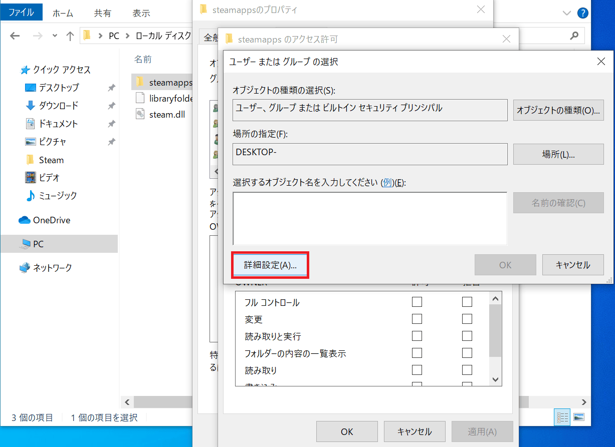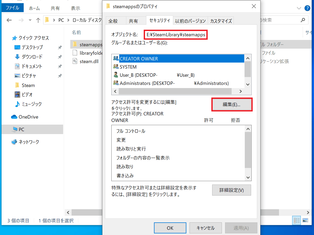 エクスプローラーから「steamapps」フォルダを左クリックし、「プロパティ」→「セキュリティ」タブを表示します。