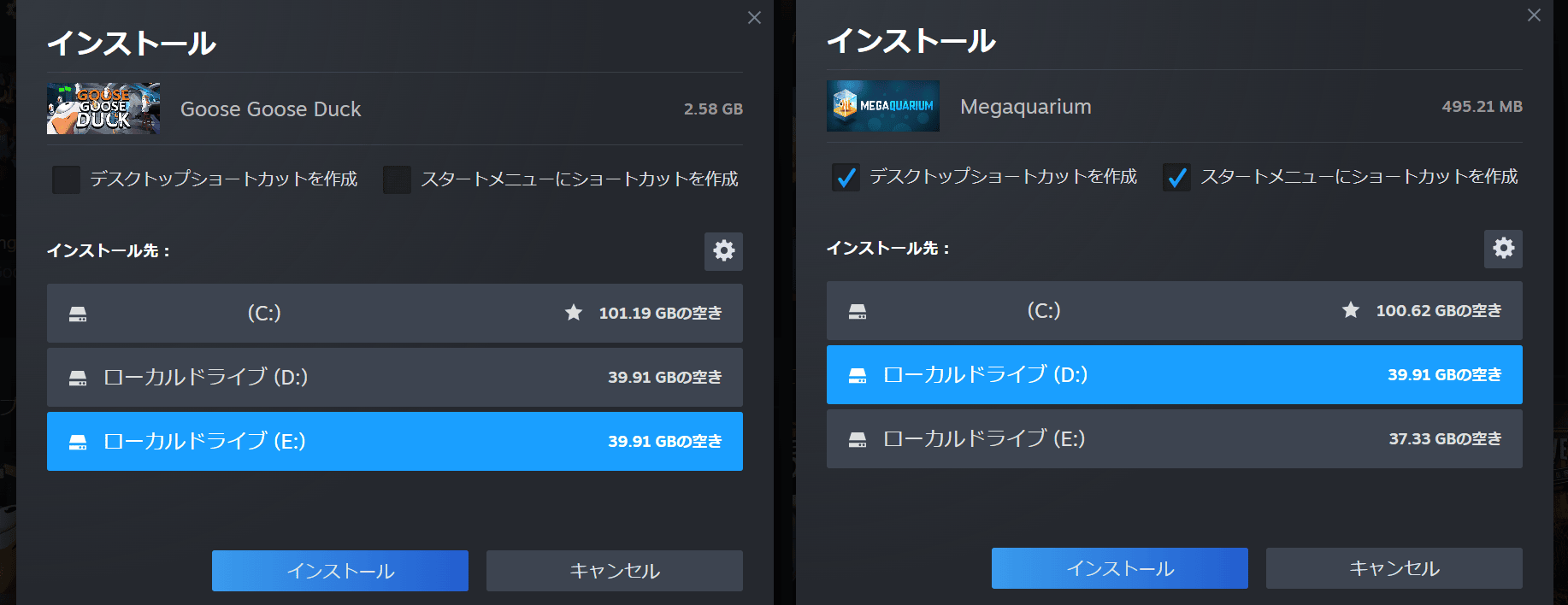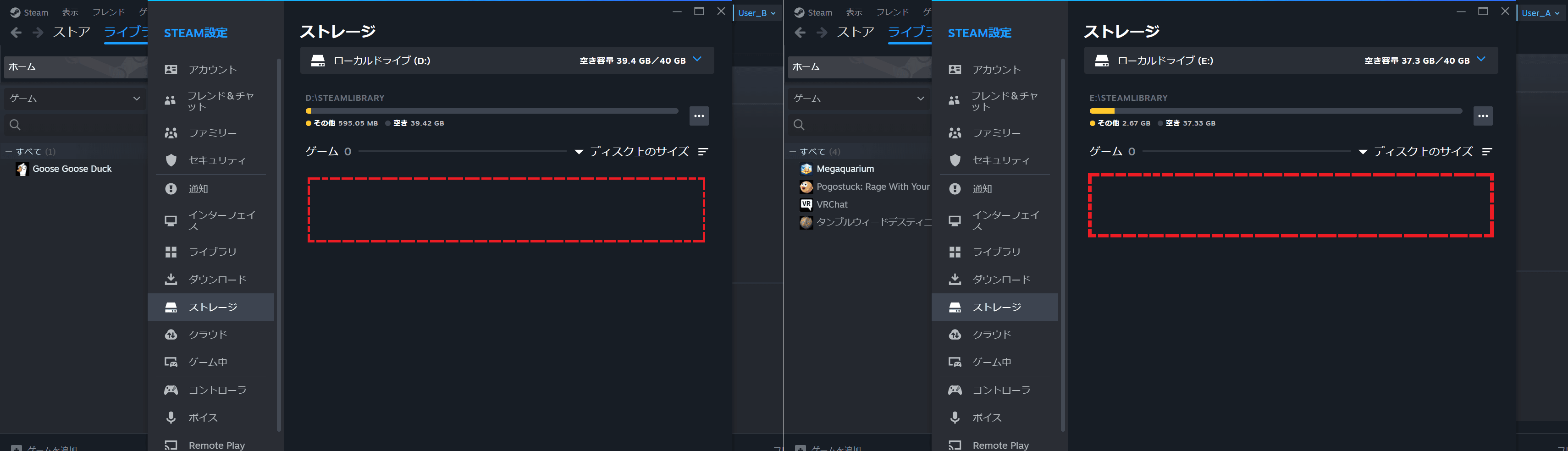 下のようにUser_B側でEドライブにゲームをインストール(下図左)、User_A側でDドライブにゲームをインストール(下図右)してみます。
