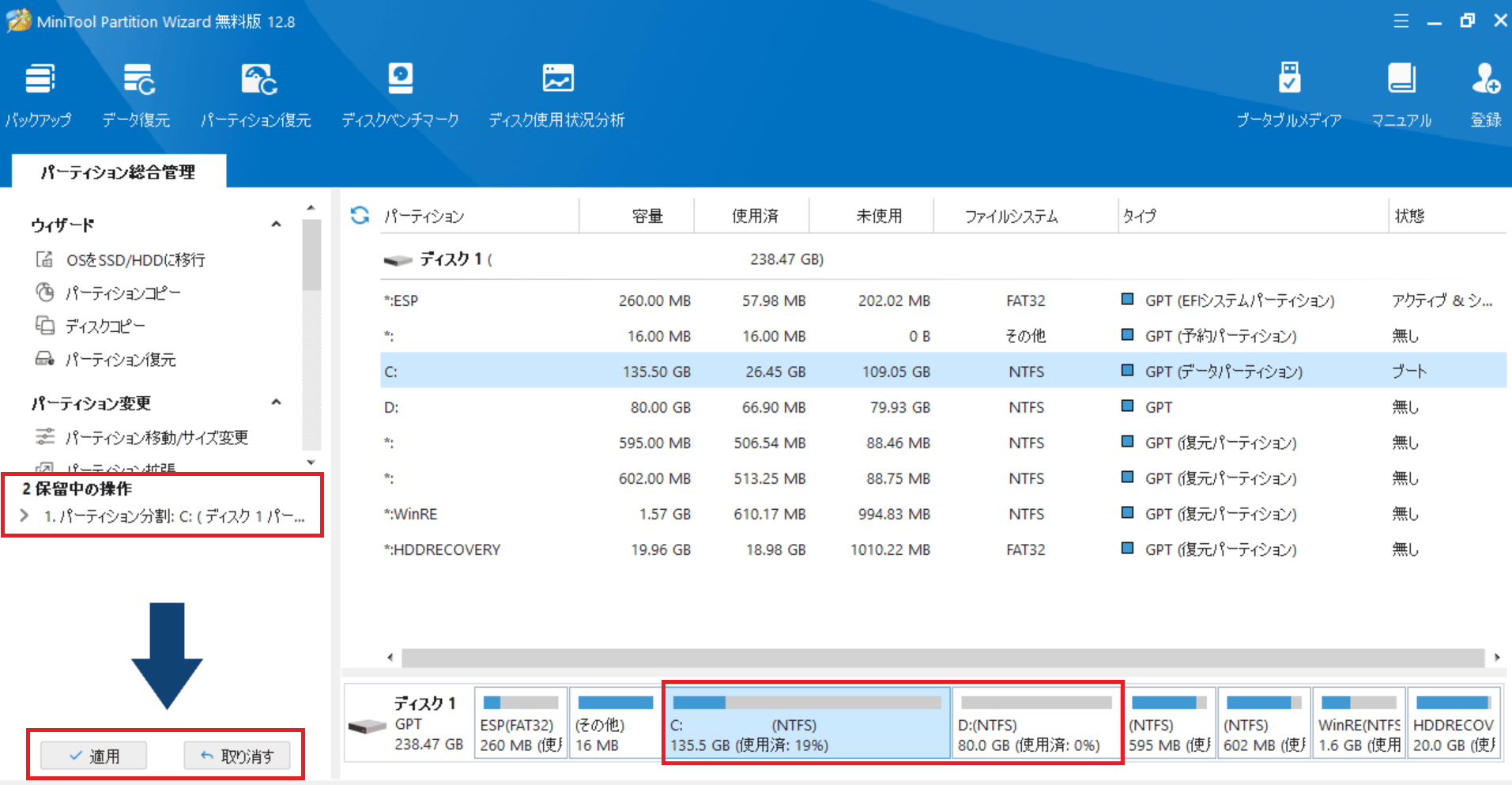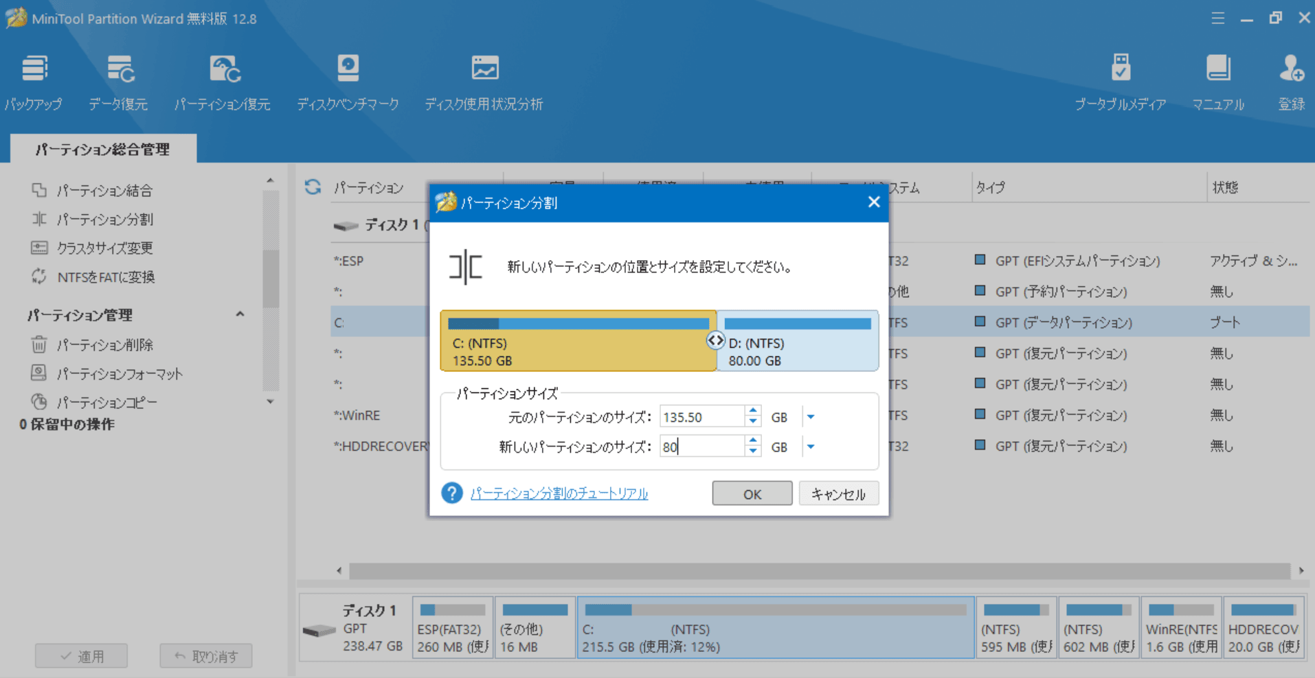 パーティションの分割には、「MiniTool Partition Wizard」というツールが無料で使うことができるのでおすすめです。
