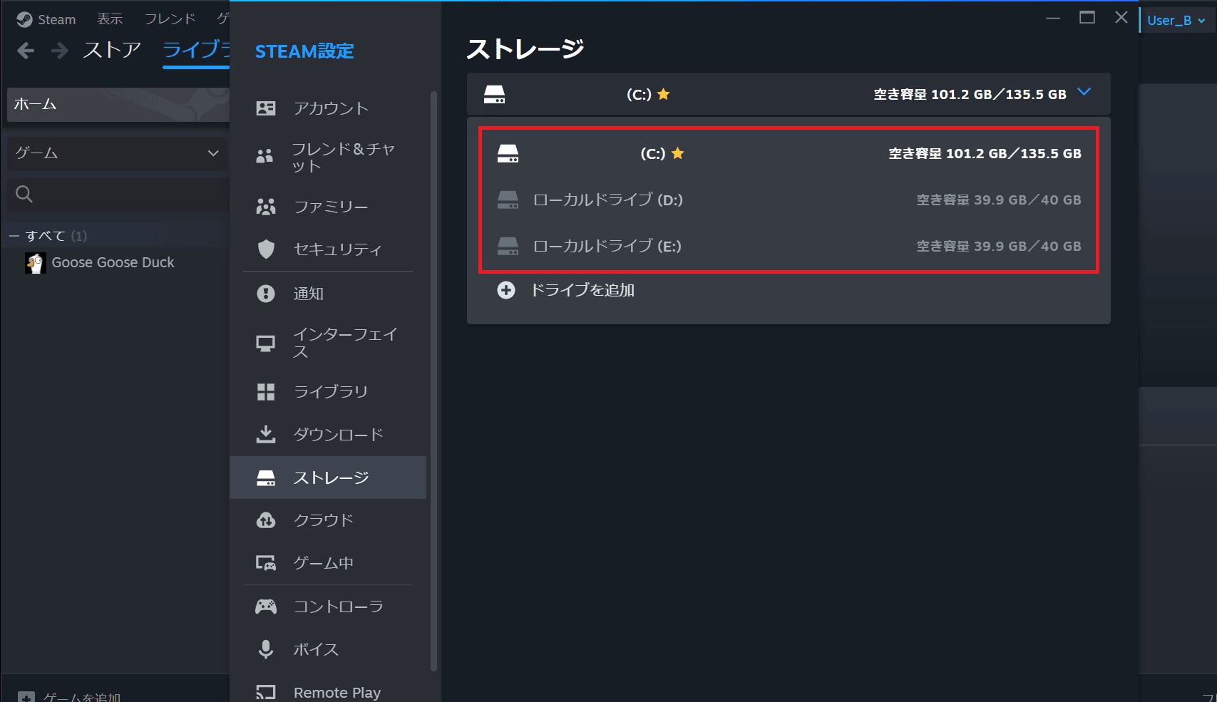 ドライブを複数用意したので、Steam上にゲームの保存領域として登録していきます。この操作はUser_A側でも、User_B側のSteamアカウントでもどちらで行っても問題ありません。