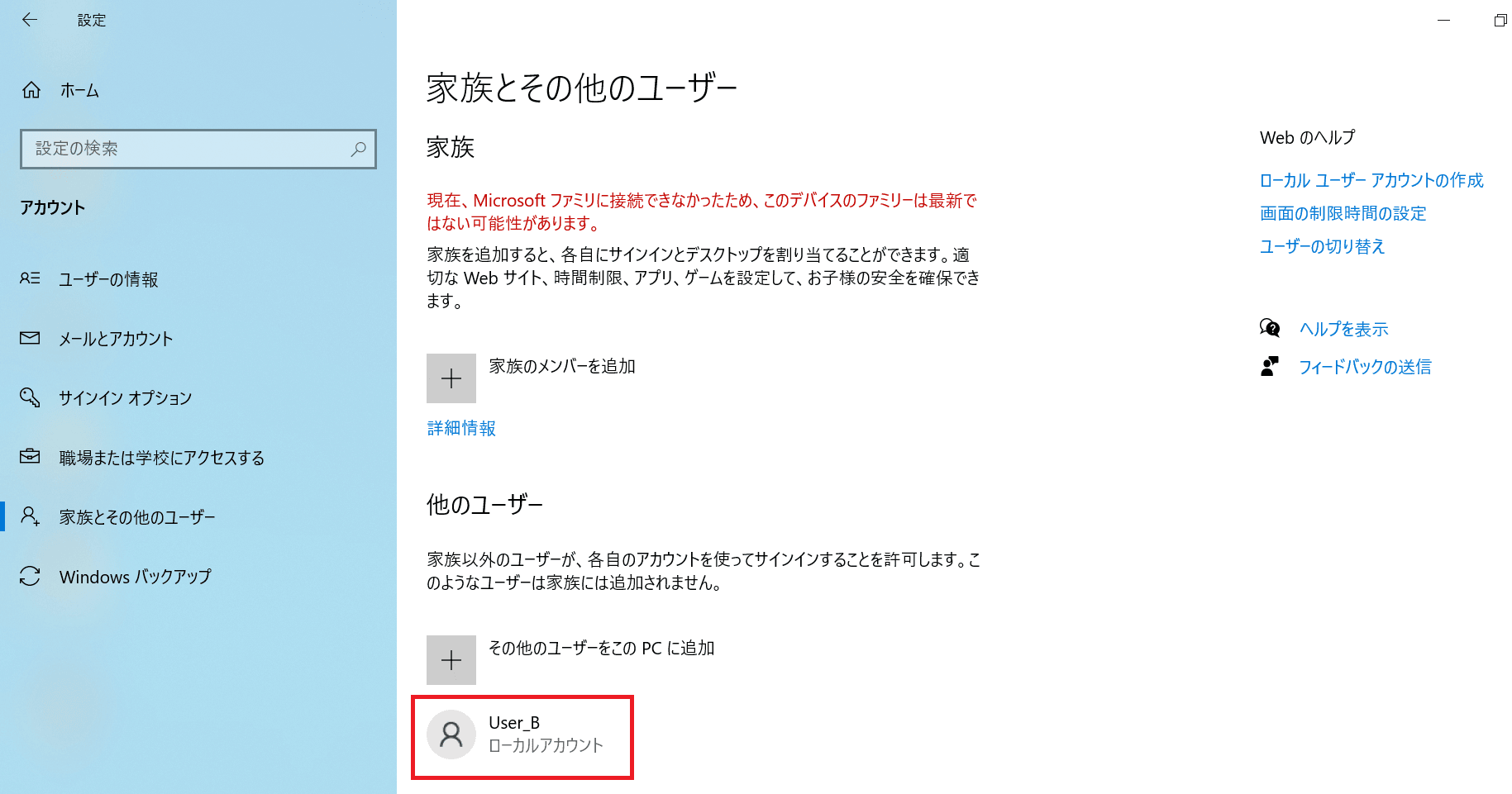 今回の例では、User_AにサインインしたうえでUser_B作成し、Windows上に2アカウントがある状態としました。