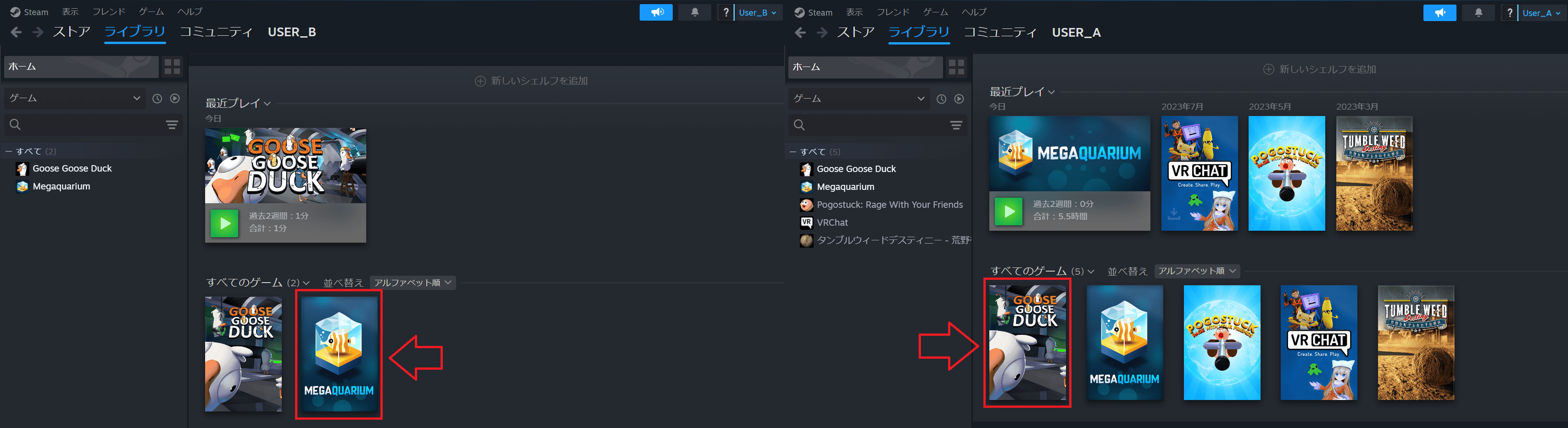 WindowsアカウントUser_A側でSteamを開いてライブラリを見てみると、User_B側でインストールしたゲーム(下図右赤枠)が表示されています。