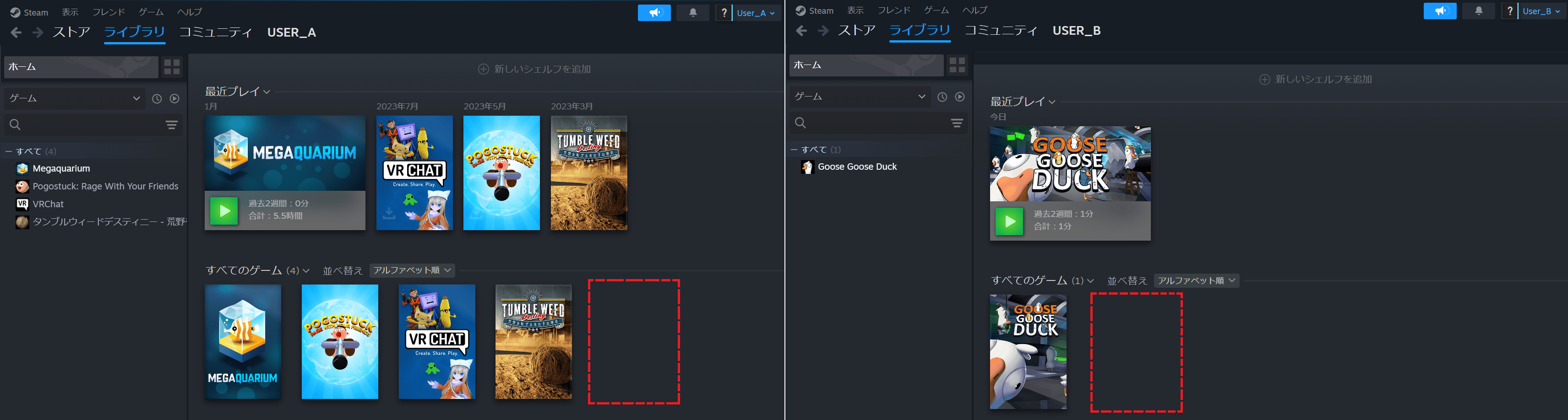 User_Aで、権限を設定する前まで表示されていたはずのゲームの表示がなくなり(下図左)、User_B側でもライブラリにUser_A側のゲームが表示されなくなったこと(下図右)を確認します。