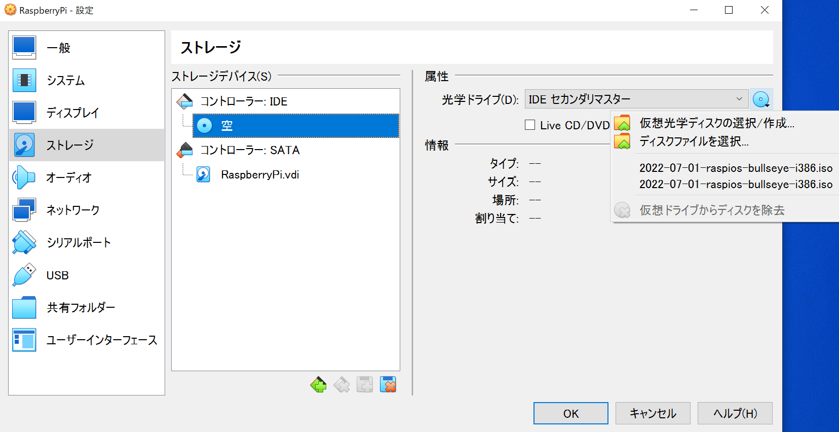 用いたファイル:2022-07-01-raspios-bullseye-i386.iso
