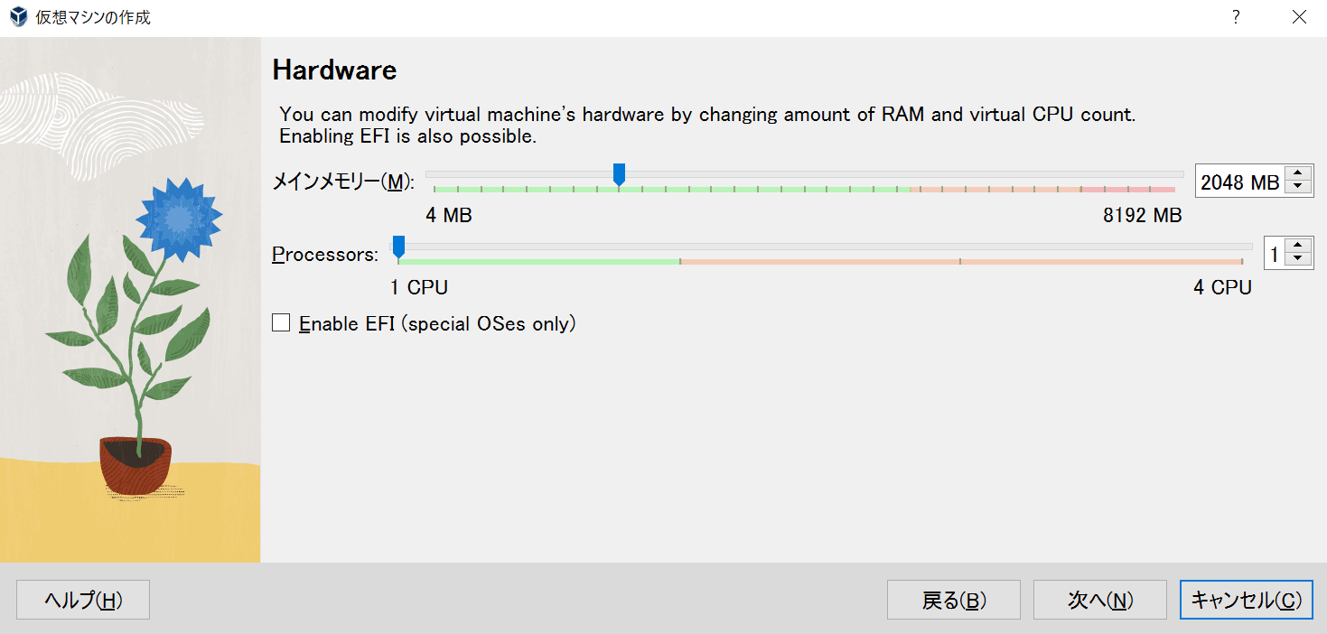 メモリとストレージサイズなどは仮想環境作成後も変更することができるため、あまり深く考えずに足りないことが無いくらいの大きさで設定しておきましょう。