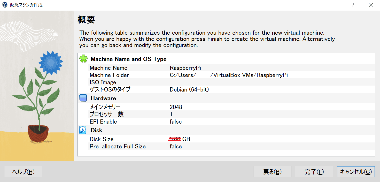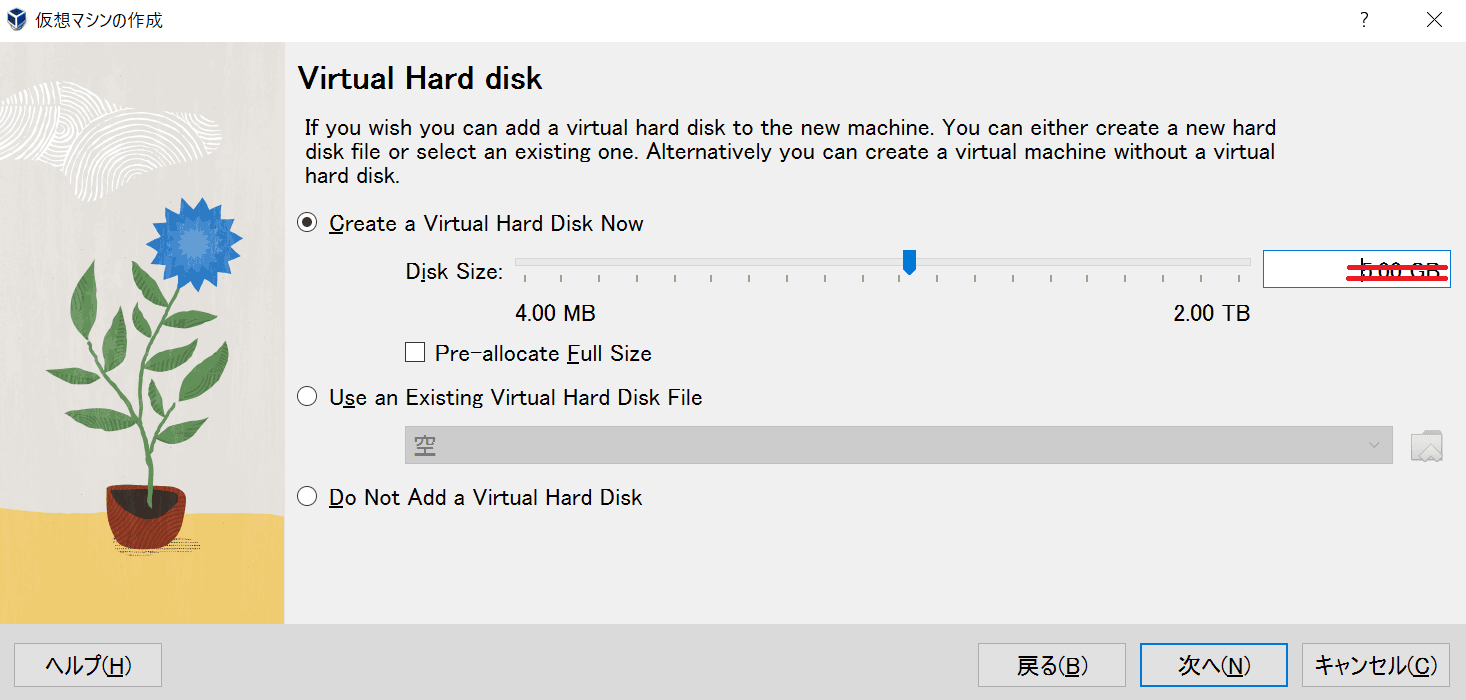 ここで注意すべきはストレージ容量の設定です。あまりに小さなディスクサイズに設定するとOSをインストールする段階で失敗します。
